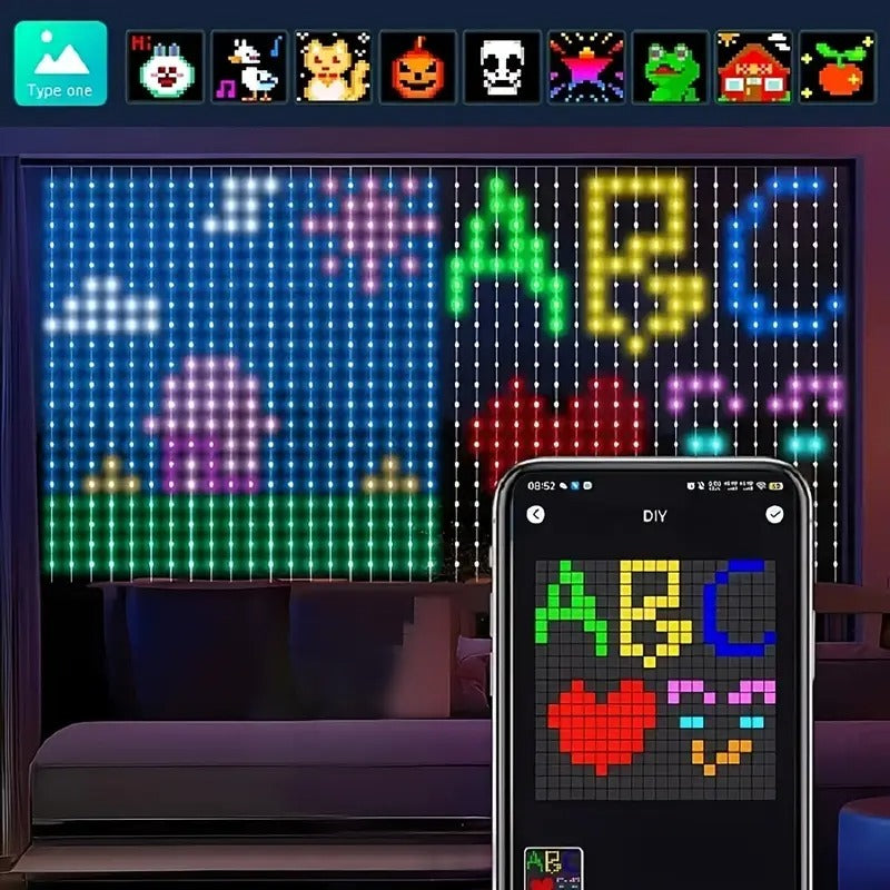Luz cortina LED RGB para decoración de interiores y exteriores, perfecta para festividades y celebraciones, con efectos de luz coloridos y sincronización musical.